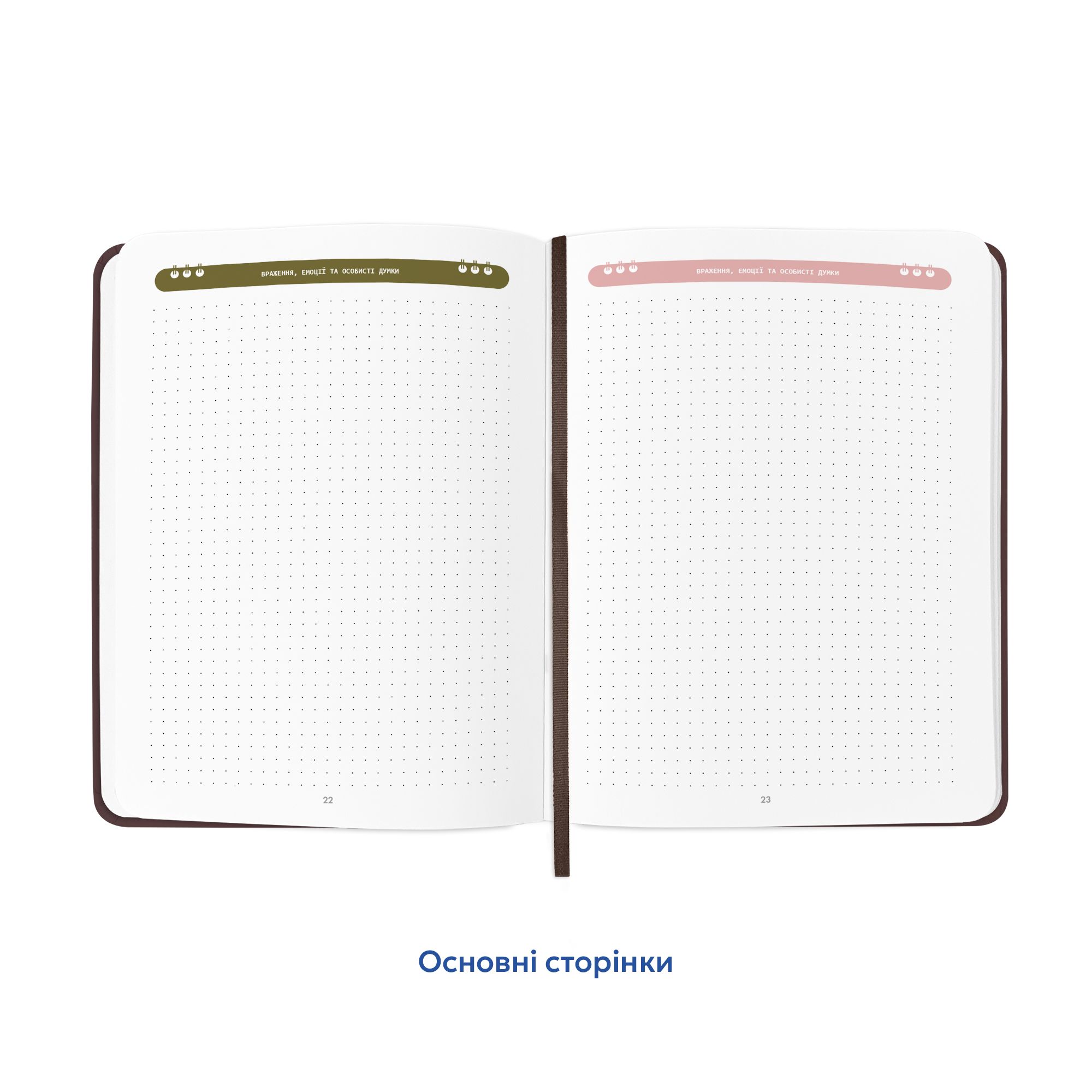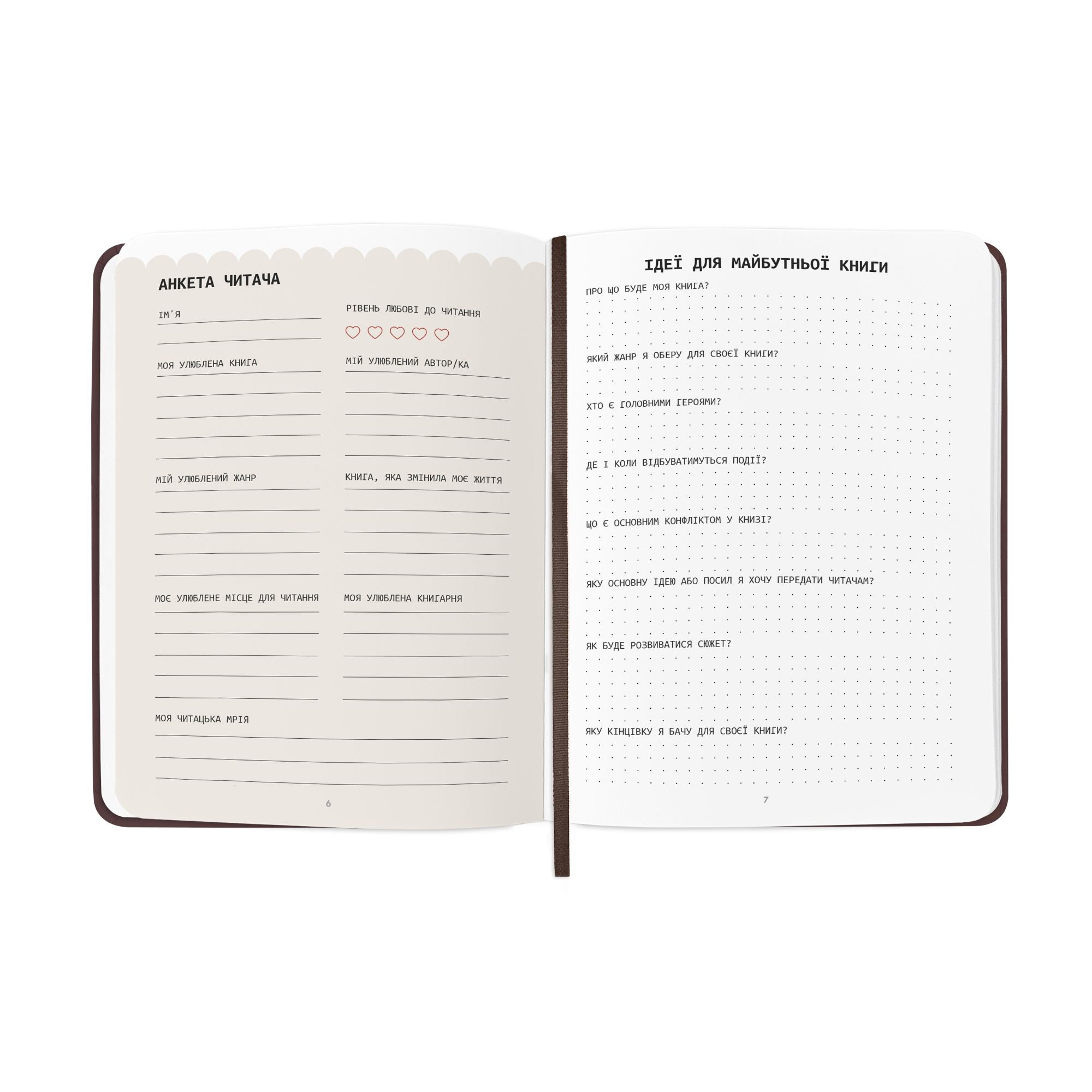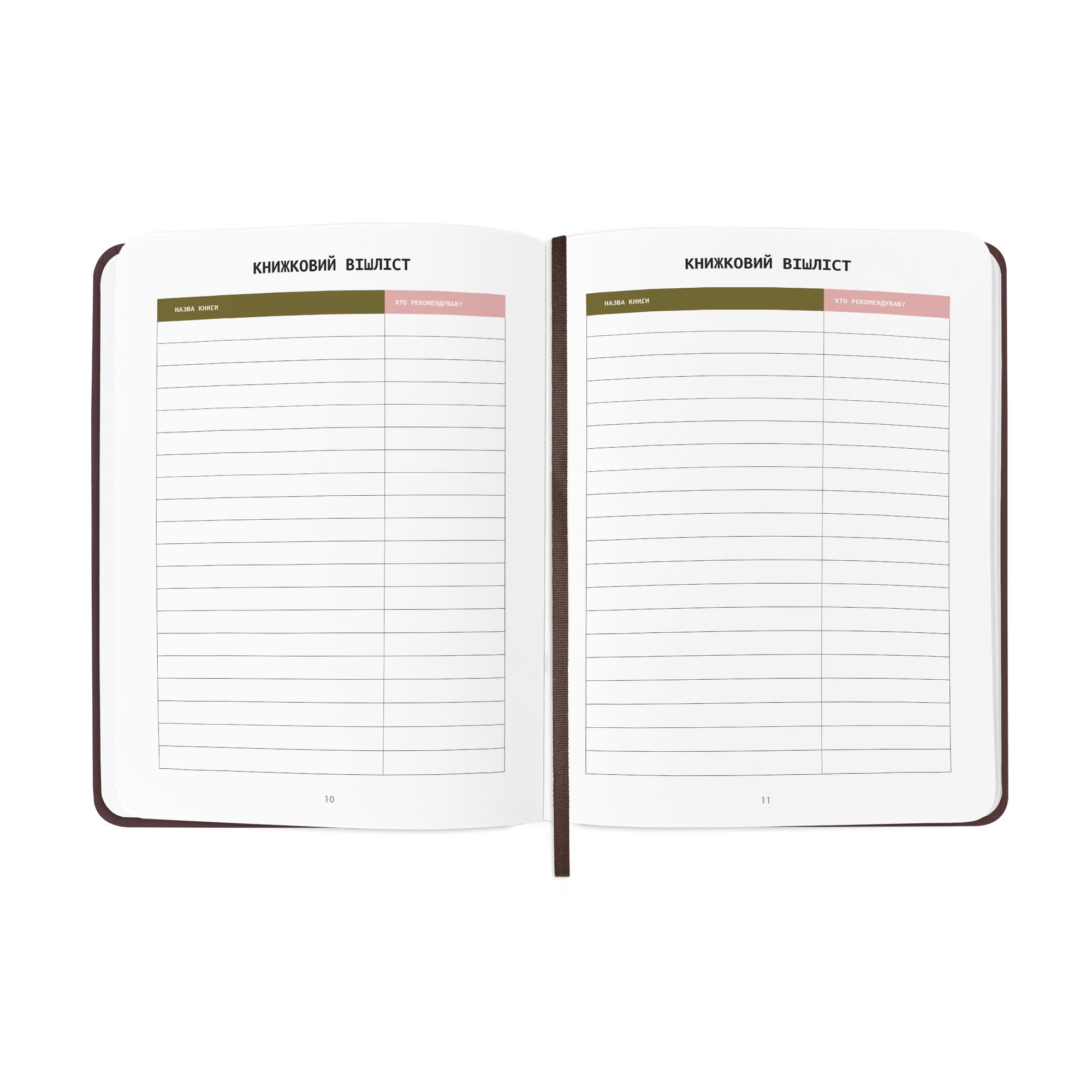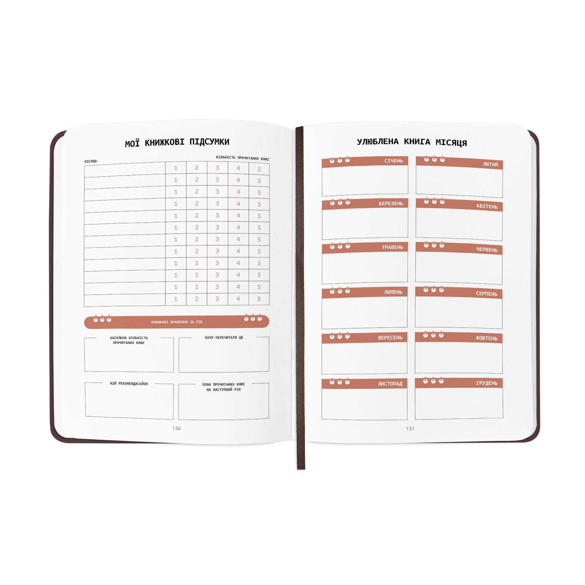 Читацький щоденник — новий простір для вражень від прочитаних книжок, прослуханих історій та найвідоміших персонажів. 30 розворотів з відгуками про книгу та улюбленими цитатами, анкета читача, книжкова поличка, трекер щоденного читання на рік, карта світу, звідки автор/ка книги, бібліотека улюблених цитат, книжковий вішліст, книжкові підсумки та сторінки в крапку для нотаток.