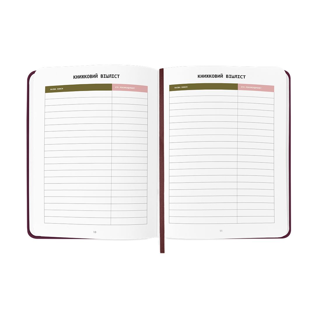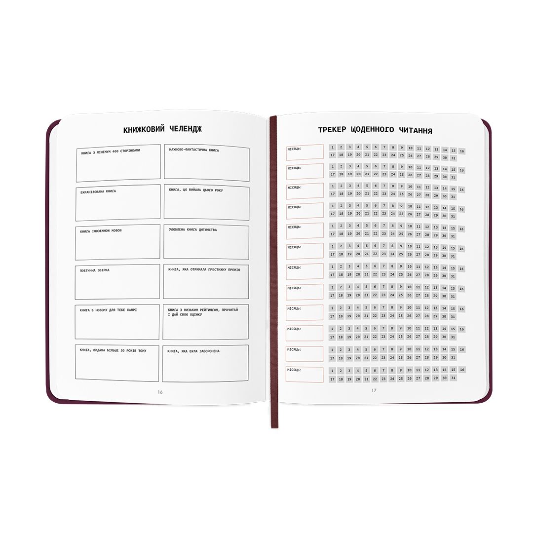 Читацький щоденник — новий простір для вражень від прочитаних книжок, прослуханих історій та найвідоміших персонажів. 30 розворотів з відгуками про книгу та улюбленими цитатами, анкета читача, книжкова поличка, трекер щоденного читання на рік, карта світу, звідки автор/ка книги, бібліотека улюблених цитат, книжковий вішліст, книжкові підсумки та сторінки в крапку для нотаток.