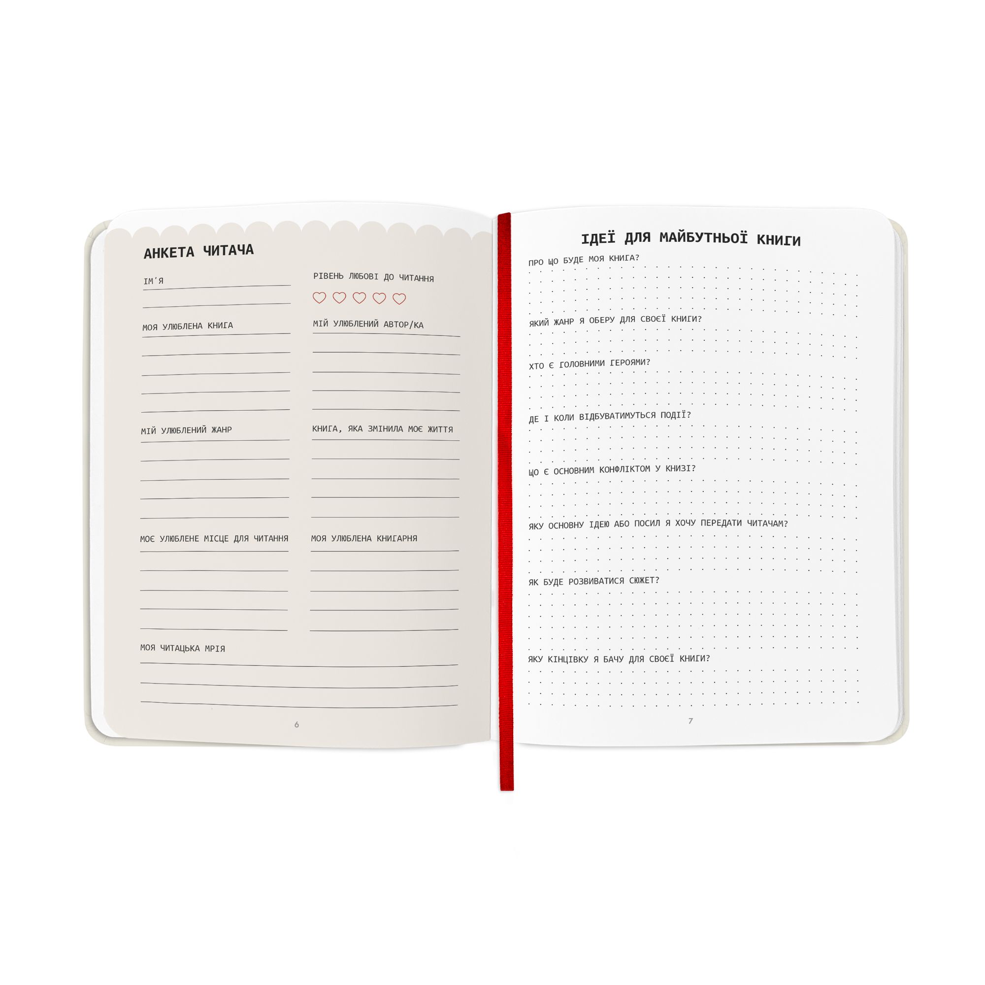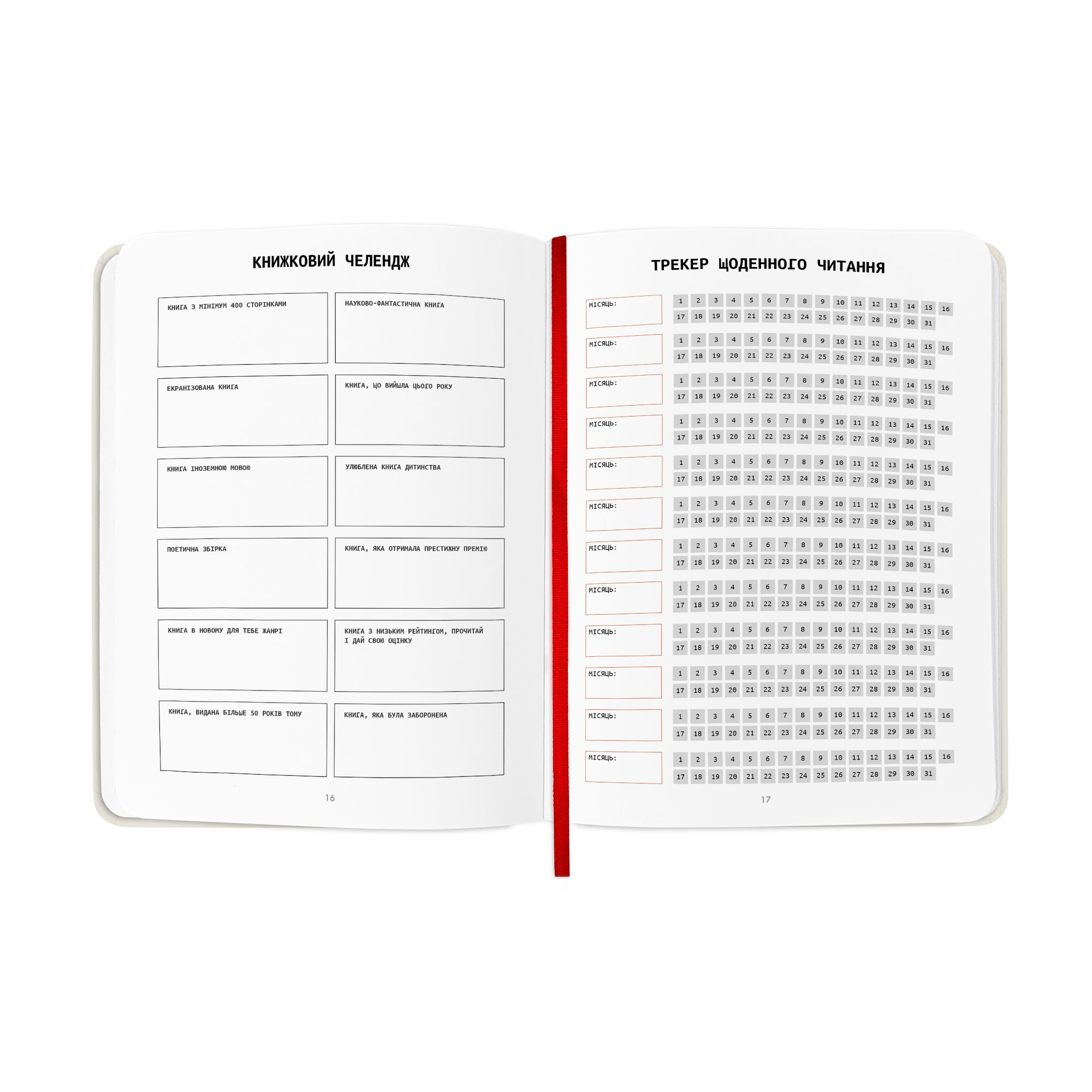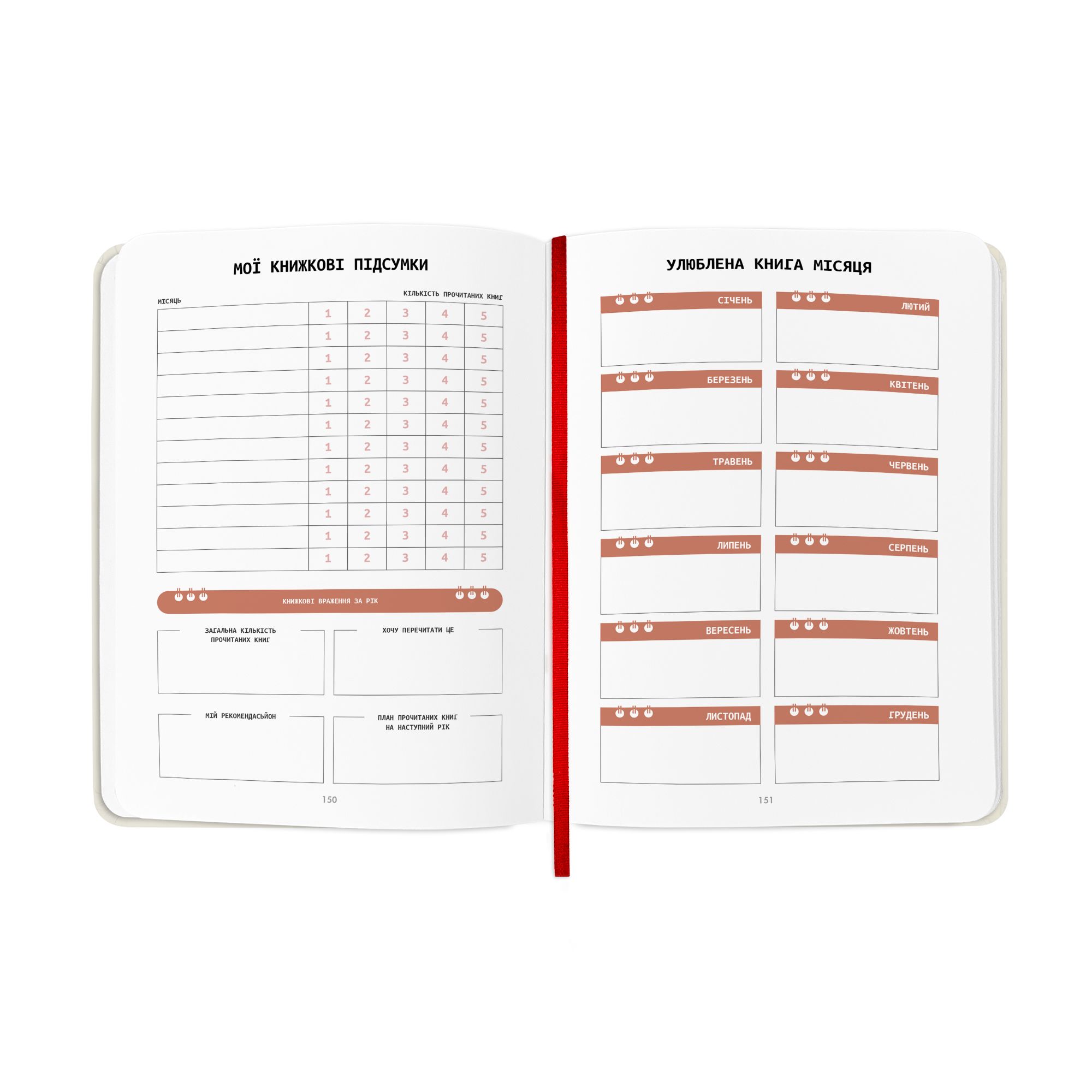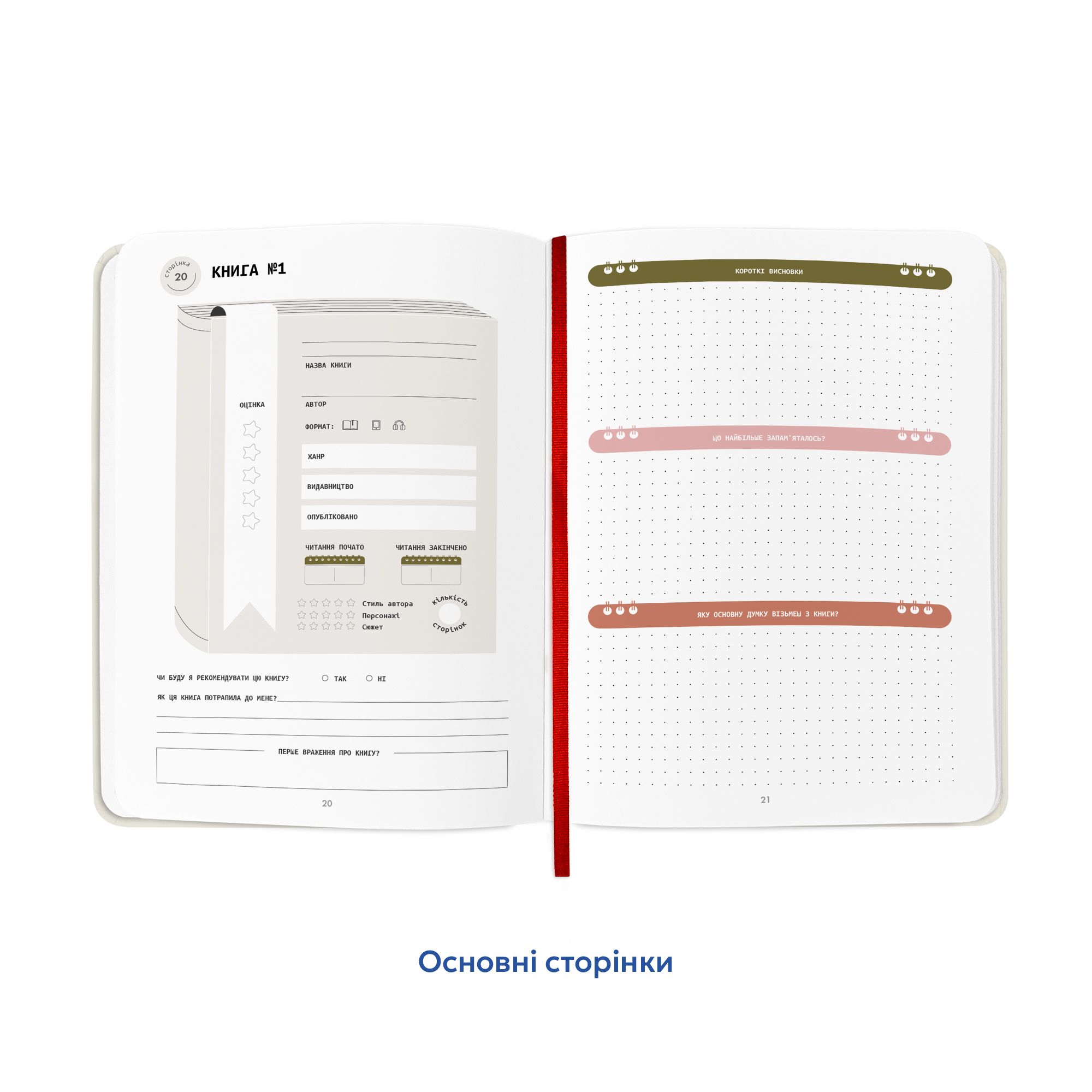 Читацький щоденник — новий простір для вражень від прочитаних книжок, прослуханих історій та найвідоміших персонажів. 30 розворотів з відгуками про книгу та улюбленими цитатами, анкета читача, книжкова поличка, трекер щоденного читання на рік, карта світу, звідки автор/ка книги, бібліотека улюблених цитат, книжковий вішліст, книжкові підсумки та сторінки в крапку для нотаток.
